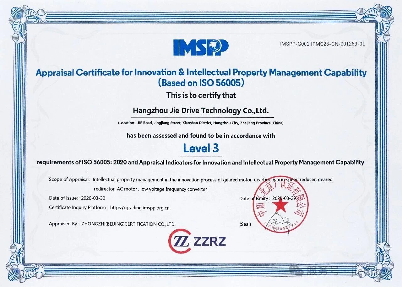 2026年3月30日,杭州杰牌傳動(dòng)科技有限公司順利通過ISO56005創(chuàng)新與知識(shí)產(chǎn)權(quán)管理能力分級(jí)評(píng)價(jià),榮獲3級(jí)認(rèn)證證書,標(biāo)志著企業(yè)在創(chuàng)新與知識(shí)產(chǎn)權(quán)融合管理領(lǐng)域取得重要階段性成果。